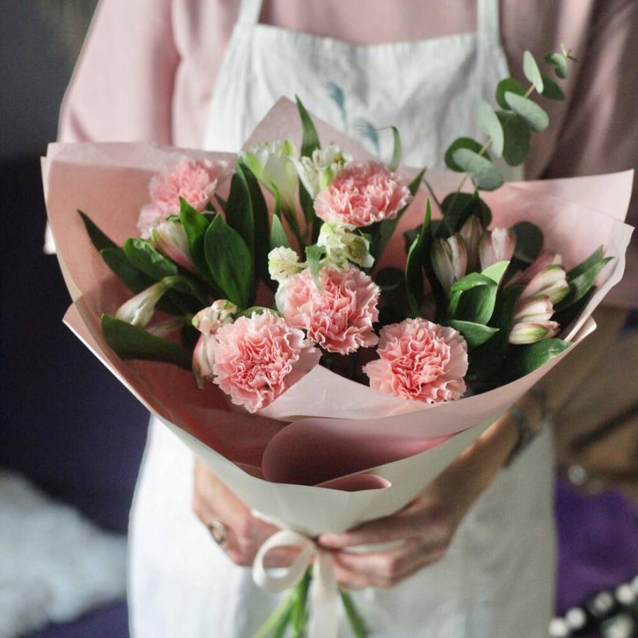 На фото букет «пудровая вуаль». В составе: альстромерия 3 шт, гвоздика 5 шт, эвкалипт 2 шт, дизайнерская упаковка 1 шт, атласная лента 1 шт, . Все цветы свежие и ароматные, букет красиво оформлен и отлично подходит для подарка. Доступна доставка цветов или самовывоз.